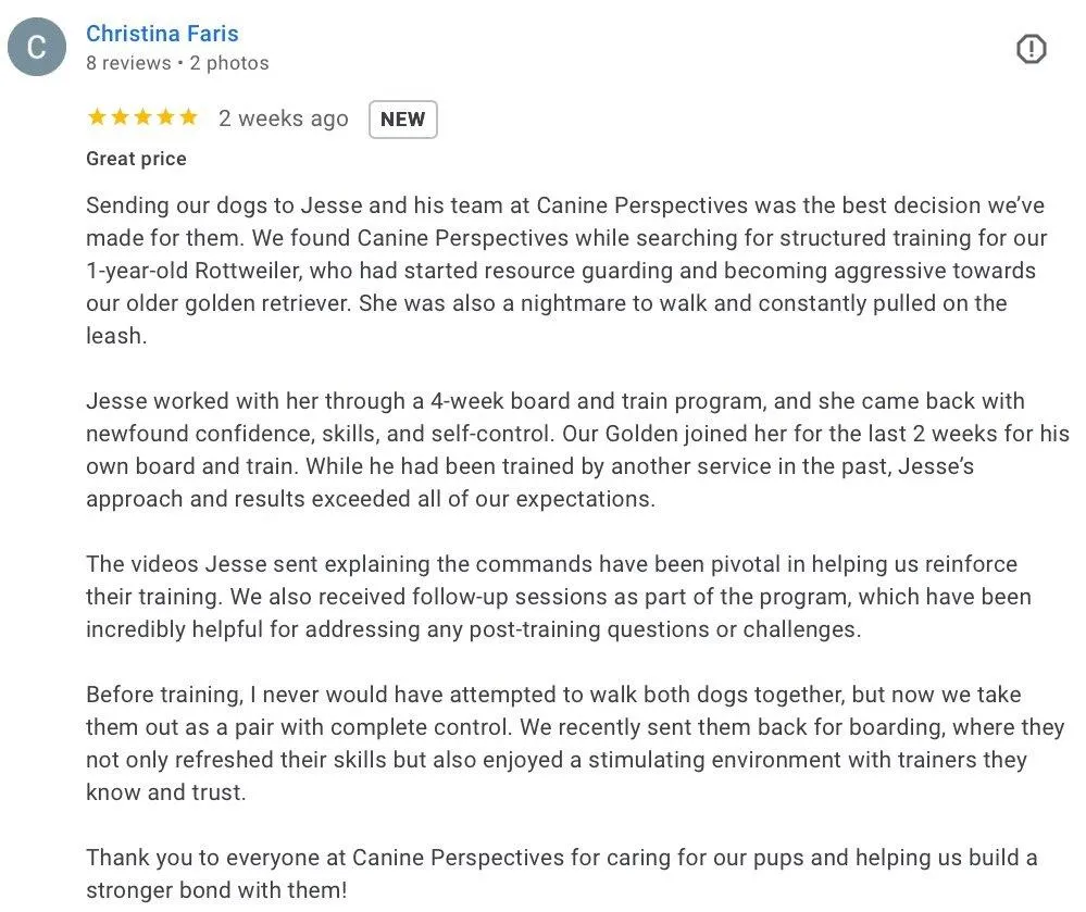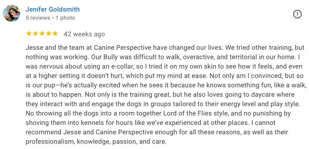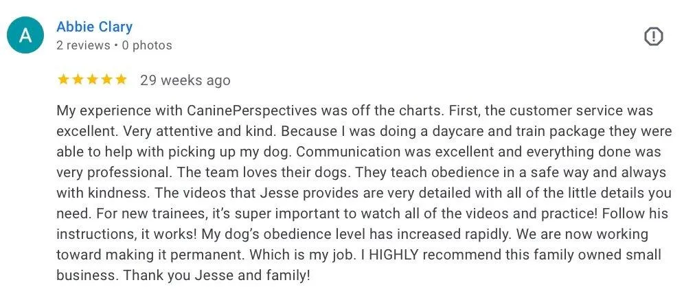 Jesse's love for dogs began when he was a child. In 2010 he began training dogs and started operating officially as Canine Perspective in 2012. Through hard work and building a reputation as a talented, transparent, and reliable trainer he was able to expand to a facility in the summer of 2019 with a team of 13 employees.